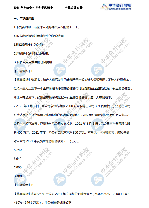 本文只展示《中级会计实务》部分精选习题+答案解析内容,中级3科完整版道习题+答案解析,文末直接下载哦: