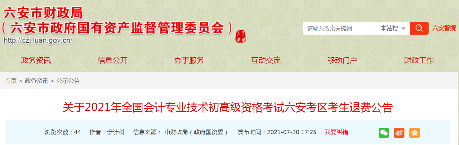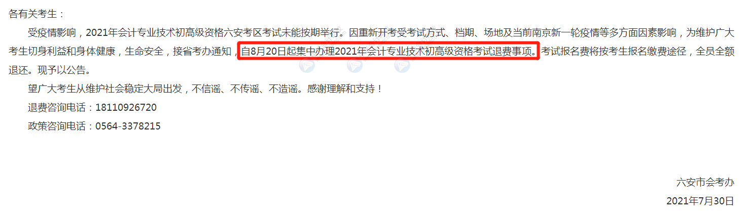 2、六安市财政局:2021初级考试取消,自8月20日起集中办理退费事项。考试报名费将按考生报名缴费途径,全员全额退还。