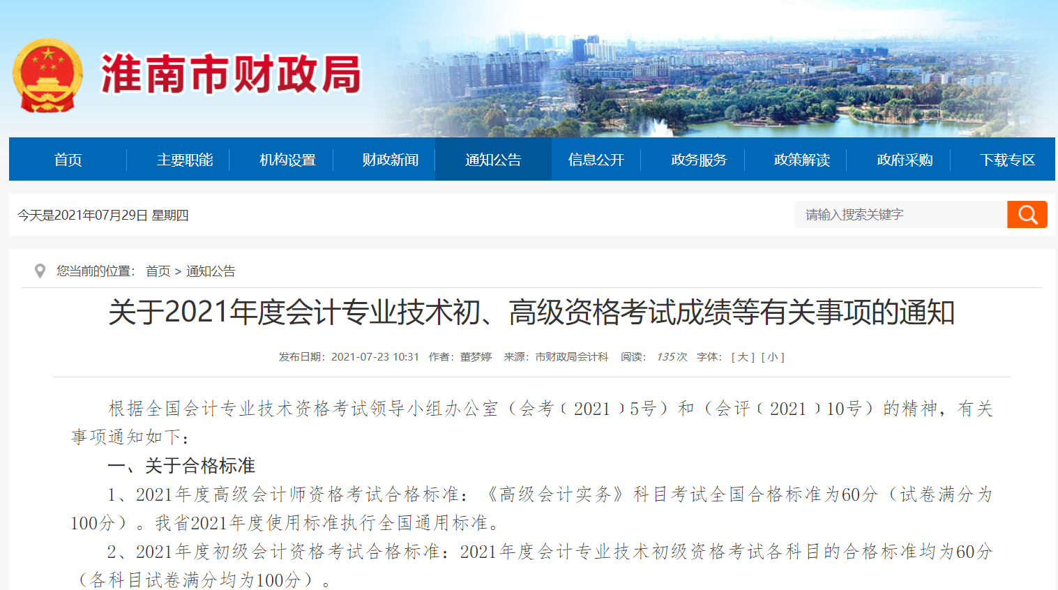 安徽淮南市财政局发布了关于2021年初级会计考试成绩等有关事项的通知,通知中告知,会计人员管理系统升级改造,暂不能进行初级考试报名资格申报、审核和证书发放等操作,相关事项另行通知。