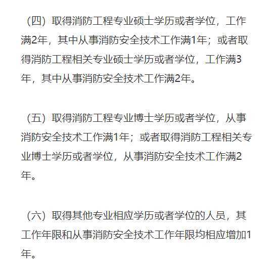 (三)取得消防工程专业大学本科学历或者学位,从事消防安全技术工作满1年;或者取得消防工程相关专业大学本科学历或者学位,从事消防安全技术工作满2年。