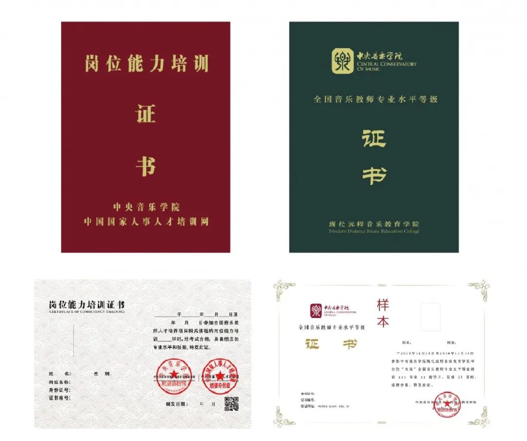 学员经过培训并通过考核后即可获得由中央音乐学院现代远程音乐教育学院和国培网共同颁发的“央音全国音乐教师专业水平等级证书”(相应级别),及“岗位能力证书”,该证书可作为音乐专业教师的聘用、考核、专业能力评价,及继续教育等专业能力参考依据,全国通用。