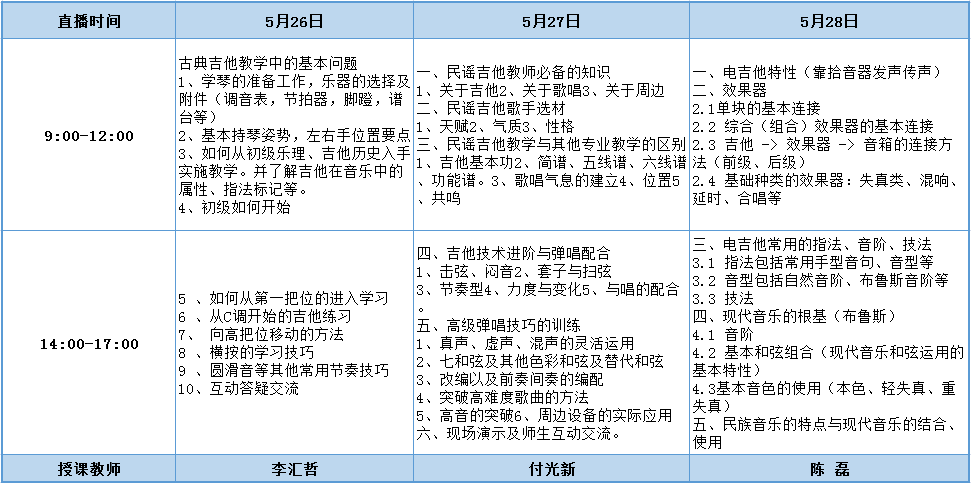 直播授课时间定于5月26日-28日(上午9:00-12:00,下午14:30-17:30)全程视频互动教学。晚间为考核曲目复习准备答疑时间。