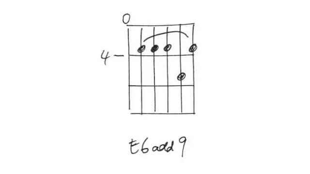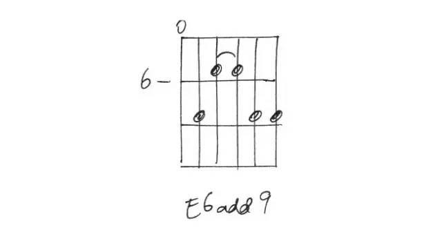 这个开放的和弦指法按起来不太舒适,是把一个普通的E major和弦加入六度音(c #)和九度音(F #)。
