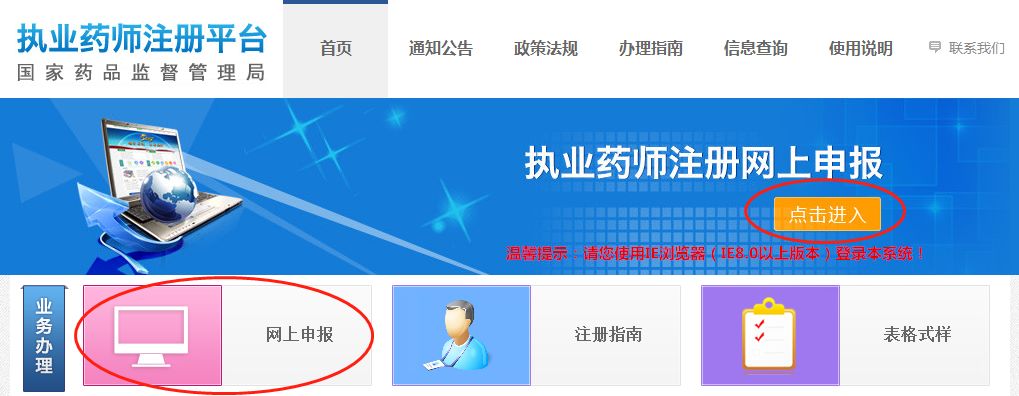 打开全国执业药师注册平台,网上申报的入口有两个:一个是网站标题下面的“执业药师注册网上申报”的【点击进入】按钮;一个是网页“业务办理”栏的【网上申报】,如图: